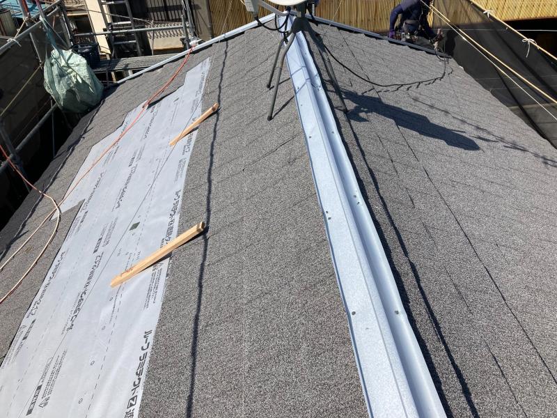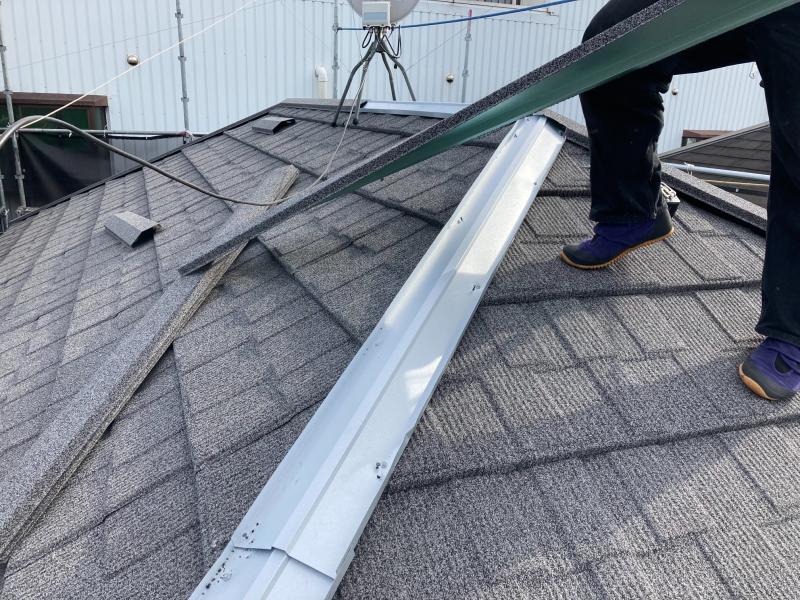 撤去後、既存屋根の上から防水シート貼り付け→役物加工・取り付け→軒先からセネター本体を取り付けていきます。